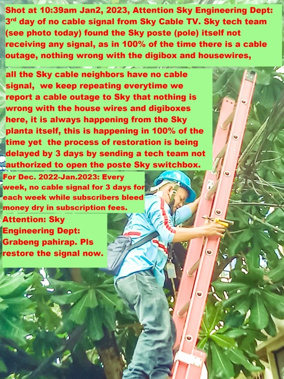 all the Sky cable neighbors have no cable signal, we keep repeating everytime we report a cable outage to Sky that nothing is wrong with the house wires and digiboxes here, it is always happening from the Sky planta itself, this is happening in 100% of the time yet the process of restoration is being delayed by 3 days by sending a tech team not authorized to open the poste Sky switchbox. For Dec. 2022-Jan.2023: Every week, no cable signal for 3 days for each week while subscribers bleed money dry in subscription fees. Attention: Sky Engineering Dept: Grabeng pahirap. Pls restore the signal now.