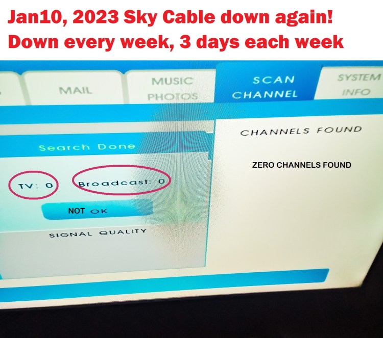 DMs sent Sky Cable TV suddenly went out again 10:58pm tonight or 10 minutes ago @SkyServes Troubleshooting, autoscan done, no effect. Pls refer to your Sky Eng’g Dept instead of delaying by sending a tech team not authorized to open Sky box at the poste (pole). Pls restore the signal now