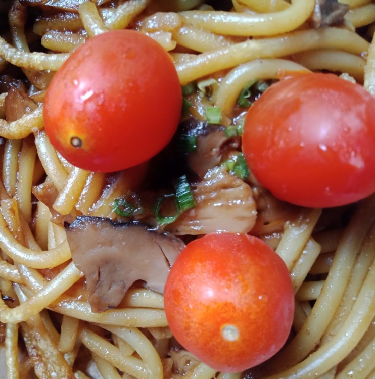 At the moment 3pm : Vegan Al dente bucatini kung pao pasta with plant-based “meat” (cherry tomatoes added for food photography design purposes)