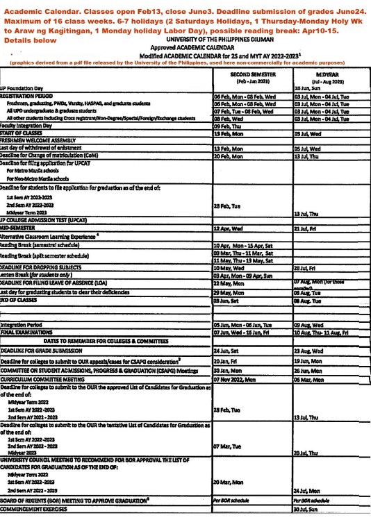 University of the Philippines Diliman Academic Calendar (graphics derived from a pdf file released by the University of the Philippines). Classes open Feb. 13, 2023 and close June 3, 2023.