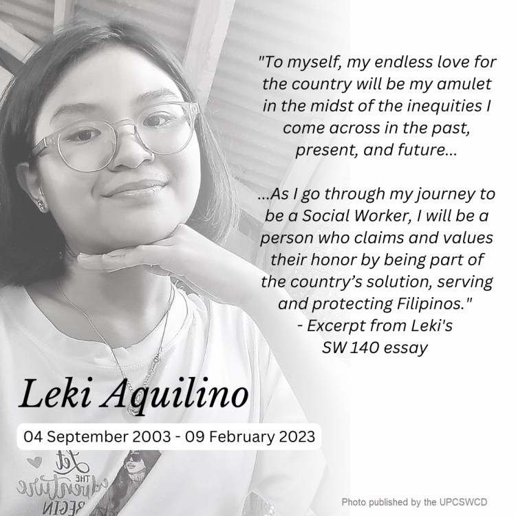 Her name was Alexi “Leki” Aquilino, 17 years old, first year student of the U.P. Diliman College of Social Work and Community Development — loved dearly by schoolmates, orgmates, the faculty and staff.