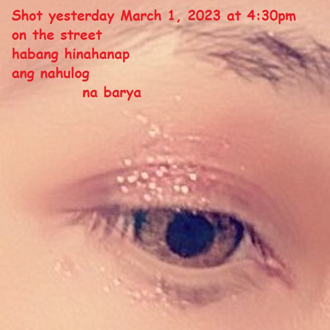 hinahanap yung nahulog na barya… shot yesterday at 4:30pm on the street Discover more from marichulambino.com Subscribe to get the latest posts sent to your email. Type your email… Subscribe Rate this:click any social media icon below to share Share on Facebook (Opens in new window) Facebook Share on X (Opens in new window) X Share on Tumblr (Opens in new window) Tumblr Email a link to a friend (Opens in new window) Email Share on Pinterest (Opens in new window) Pinterest Print (Opens in new window) Print Share on Reddit (Opens in new window) Reddit Like Loading...