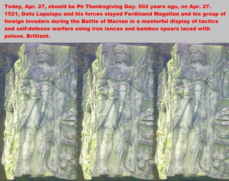 Today, Apr. 27, should be Ph Thanksgiving Day. 502 years ago, on Apr. 27, 1521, Datu Lapulapu and his forces slayed Ferdinand Magellan and his group of foreign invaders during the Battle of Mactan in a masterful display of tactics and self-defense warfare using iron lances and bamboo spears laced with poison. Brilliant.