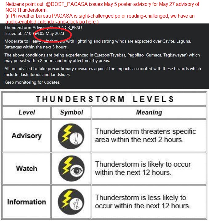 Netizens point out: @DOST_PAGASA issues May 5 poster-advisory for May 27 advisory of NCR Thunderstorm 2 hours ago