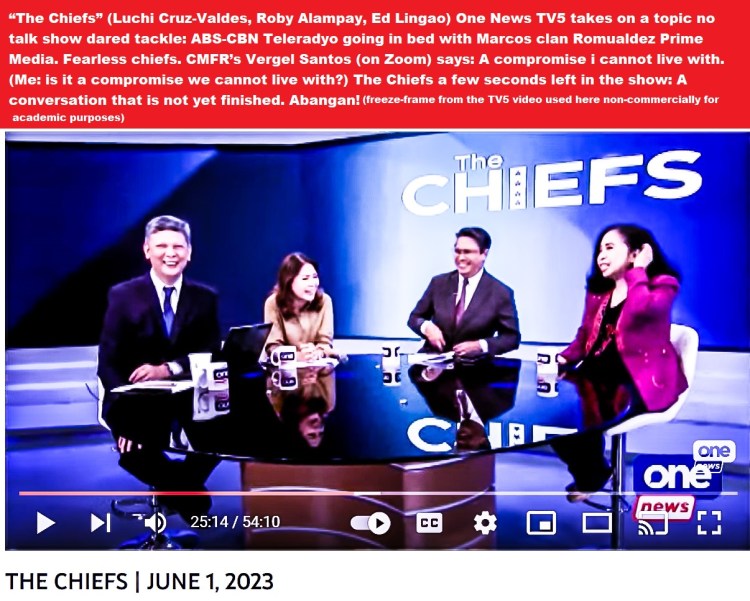 “The Chiefs” (Luchi Cruz-Valdes, Roby Alampay, Ed Lingao) One News TV 5 takes on a topic no talk show dared tackle: ABS-CBN Teleradyo going in bed with Marcos clan Romualdez Prime Media. Fearless chiefs. Guest Vergel says: A compromise i cannot live with. (Me: is it a compromise we cannot live with?) The Chiefs conclude with a few seconds left in the show: A conversation that is not yet finished. Abangan!
