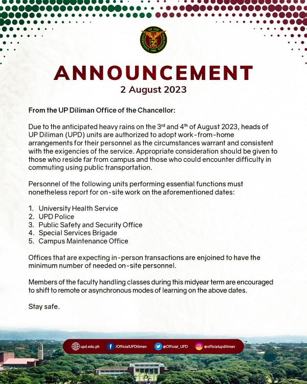 A couple of hours ago, the faculty received a memo from the Dean relaying the memo of the U.P. Diliman Chancellor encouraging faculty members handling classes this MidYear Term — in view of the heavy rains this Thursday and Friday, August 3, 2023 and August 4, 2023 — to shift to remote or asynchronous modes of learning on said dates.