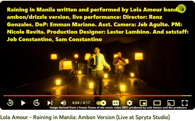 written and performed by Lola Amour band, the ambon/drizzle version, live performance: Director: Renz Gonzales. DoP: Emman Mariano. Asst. Camera: Jeb Agulto. PM: Nicole Revita. Production Designer: Lester Lambino. And setstaff: Job Constantino, Sam Constantino