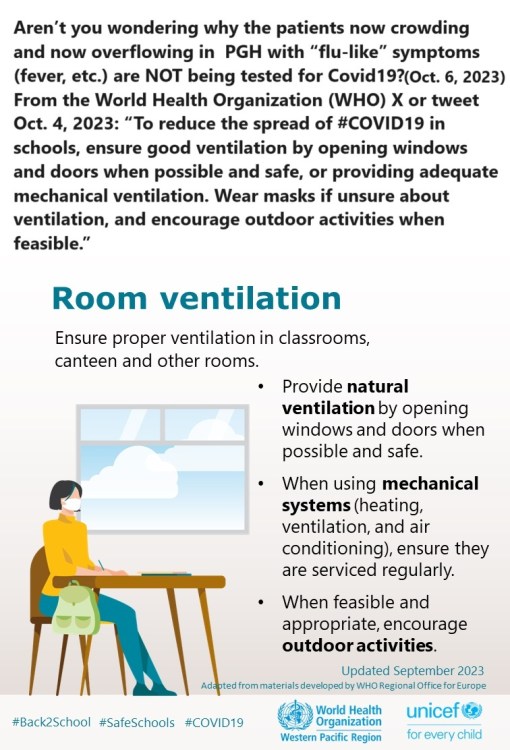 Aren’t you wondering why the patients now crowding and now overflowing in PGH with “flu-like” symptoms (fever, etc.) (Oct. 6, 2023) are NOT being tested for Covid19?