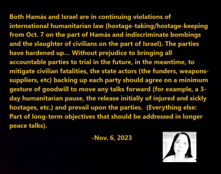 Both Hamás and Israel are in continuing violations of international humanitarian law (hostage-taking/hostage-keeping from Oct. 7 on the part of Hamás and indiscriminate bombings and the slaughter of civilians on the part of Israel). The parties have hardened up… Without prejudice to bringing all accountable parties to trial in the future, to minimize civilian fatalities, the state actors (funders, weapons-suppliers, etc) backing up each party should agree on a minimum gesture of goodwill to move any talks forward (3-day humanitarian pause, release of injured and sickly hostages, etc.) and prevail upon the parties. (Everything else: Part of long-term objectives that should be addressed in longer peace talks)