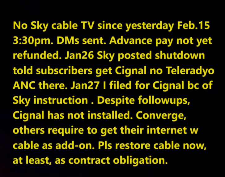 Staff said no Sky cable TV signal since yesterday Feb.15 3:30pm. DMs sent. 5 months advance payment not yet refunded. Jan26 Sky posted shutdown advised subscribers to get Cignal even if there is no Teleradyo or ANC there. Jan27 I filed a Cignal application because of Sky instruction. Despite followups, Cignal has not installed. Converge and other cable operators require to get their internet with cable only as add-on. Pls restore the cable now, at least, as contractual obligation.