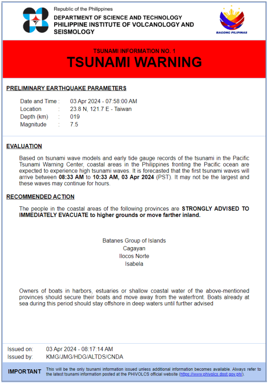 Breaking. Posted 10am MNL time: Batanes: See Tsunami alert (aftermath of Taiwan Earthquake). Residents of affected areas should evacuate now.