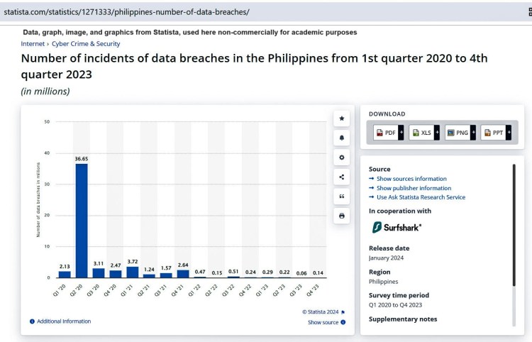 See Statista research department. “Number of data breaches Philippines 2020-2023, by quarter”. Statista Site, 4 April 2024. Retrieved from: https://www.statista.com/statistics/1271333/philippines-number-of-data-breaches/