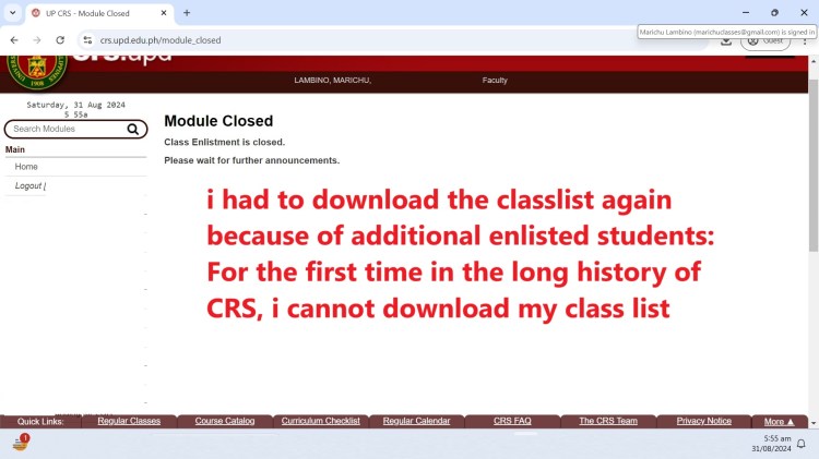 For the first time in the history of humankind, somebody shut down the classlist-download function of CRS even to the handling faculty: It displays the announcement that enlistment is closed: i’m not trying to enlist po, i’m trying to teach po