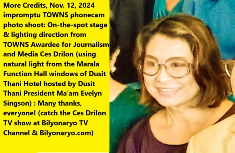 Stage and Lighting Direction by TOWNS Awardee for Journ and Media Ces Drilon (using natural light from the Marala Function Hall windows of Dusit Thani Hotel) Executive Production by TOWNS Awardee for Business and Dusit Thani President Ma’am Evelyn Singson: Many thanks!!!