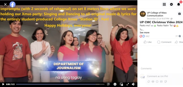 ANSWER: Our students are — most creative. University of the Philippines College of Mass Comm students, admin staff, faculty sing and dance to all-original music and lyrics in an entirely student-produced video College Xmas “station ID” shot and produced in 3 days. HAPPY HOLIDAYS, EVERYONE!