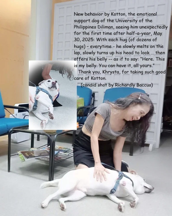 5 hours ago, in the office: Kotton, the emotional support dog of the University of the Philippines Diliman (we haven’t seen each other in half-a-year) when we were in the office, each time I hugged him, kept slowly melting on his side to show me his belly, a DOZEN times, (a “new behavior” towards me, he’s usually giddy) — as if to say: “Here. This is my belly. You can have it, all yours.”