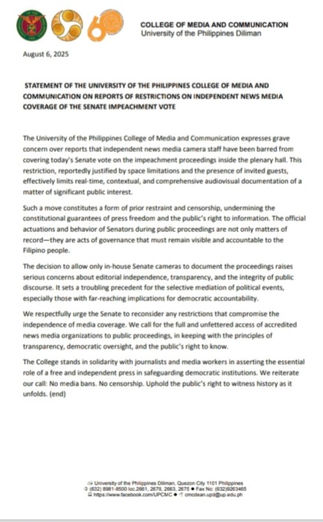 The University of the Philippines College of Media and Communication expresses grave concern over reports that independent news media camera staff have been barred from covering today’s Senate vote on the impeachment proceedings inside the plenary hall. This restriction, reportedly justified by space limitations and the presence of invited guests, effectively limits real-time, contextual, and comprehensive audiovisual documentation of a matter of significant public interest.