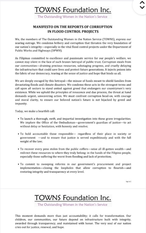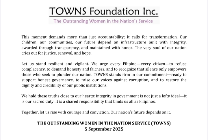 The Outstanding Women in the Nation’s Service (TOWNS) express “searing outrage” over massive corruption in flood control projects and demand accountability, transparency, restoration, justice, and long-term transformation