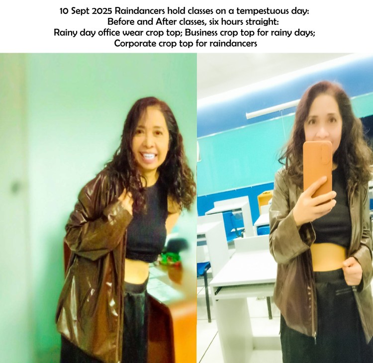 10 Sept 2025 Raindancers hold classes on a stormy day: Before and After classes, six hours straight: Rainy day office wear crop top; Business crop top for rainy days; Corporate crop top for raindancers
