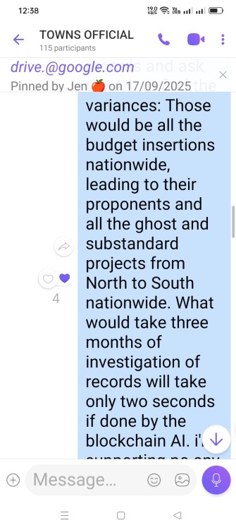 “From marichu: Yes i support TOWNS joining the Integrity Chain and the Blockchain Council. DBM started to use blockchain in July 2025. During the meeting with Blockchain, we can ask whether DBM has already uploaded its 2022-2025 records (all are public records anyway) on the DBM blockchain platform. Sana DBM has done that. During the meeting with the Blockchain Council we can ask for a demo using the DBM 2022-2024 records and ask the A.I. to find the variances (nb: variances between the proposed budget and the GAA budget on third reading and the GAA after bicam then the GAA upon signing). Those would be all the budget insertions nationwide, leading to their proponents and all the ghost and substandard projects from North to South nationwide. What would take three months of investigation of records will take only two seconds if done by the blockchain AI. i’m supporting po any move to require the DPWH, COA, Customs, BIR (subject to Data Privacy Act), Dep Ed, SEC, LGUs, Ombudsman’s Office, and Sandiganbayan, to upload records of all transactions of their offices and status reports of performance of public functions.It’s a start po and part of institutional reform. It just takes an executive order, will power, untiring watch from all sectors. i stan this transparency initiative po. Thanks, thanks. -from marichu”