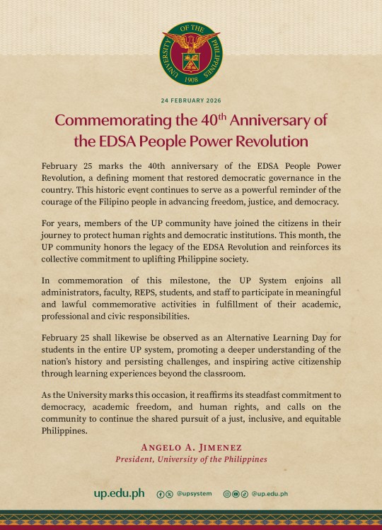 Feb25, 2026, 40th Anniversary of the People’s Uprising, is Alternative Learning Day in the entire UP System