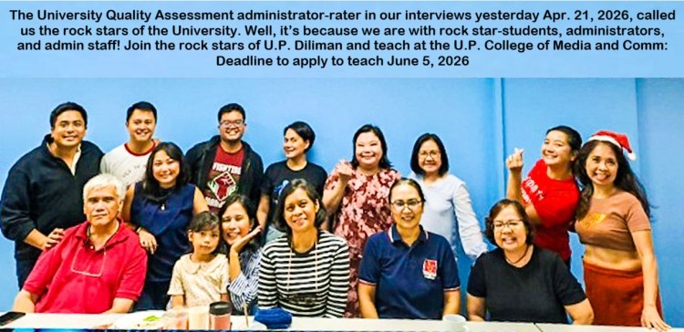 The University Quality Assessment administrator-rater in our interviews yesterday Apr. 21, 2026, called us the rock stars of the University. Well, it’s because we are with rock star-students, administrators, and admin staff! Join the rock stars of U.P. Diliman and teach at the U.P. College of Media and Comm: Deadline to apply to teach June 5, 2026.