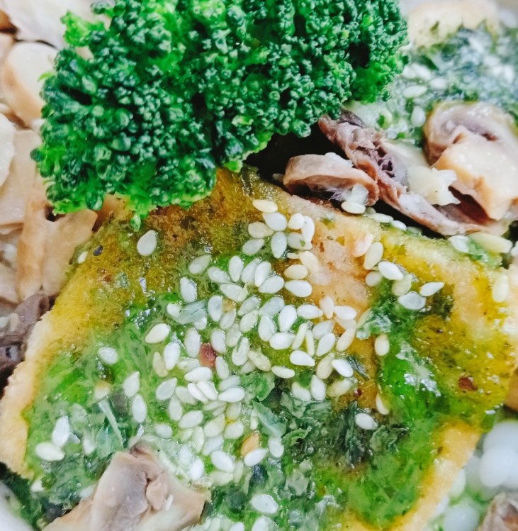 At the moment 6am Vegan breakfast before work, High-protein High-fiber: Soft tofu glazed with cilantro sauce, mushrooms 🍄, brocolli, Adlai grains. Good morning 🌄!