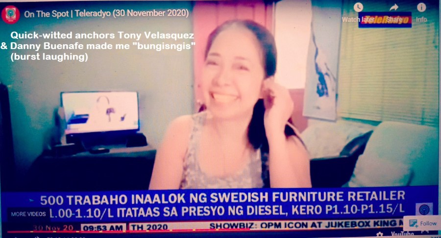 Wait — ngayon ko lang napansin na pareho kaming kulay ng suot ng news anchor (it’s only now that I noticed that i’m wearing the same color as what the news anchor is wearing). Hindi po kami nag-usap (it’s just a happy coincidence). i wear pastel colors and neutrals for interviews in the pastel room (i used to wear all-pastel green or mint green to match the room but after several interviews, i ran out of pastel greens so now it’s any pastel or neutral tone. Other than that, in any other location, for television, you would sometimes be advised to wear bright, solid colors.)