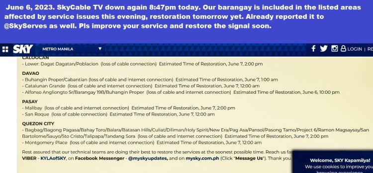 On DM chat @SkyServes cable TV was down starting 8:47pm today, troubleshooting done, autoscan done, no use. Our barangay is included in the areas listed as affected by service issues. Don’t waste time by sending tech team not authorized to check poste (pole) Pls refer to ur Engg Dept to restore cable now. Tnx.