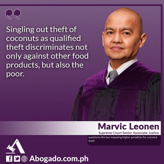No-cook Fruits. Amarille vs. People, acquitted, theft of coconuts, Justice @marvicleonen concurring: “Singling out theft of coconuts discriminates not only against other food products, but also the poor.” All living things agree: Mangoes, guavas, other drupes, other fruits have the right to equal treatment under the law.