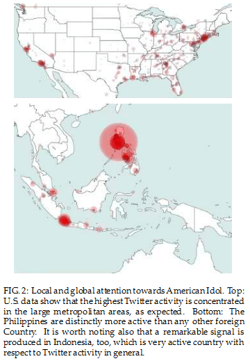 Excerpts: “xxx(S)earch engine queries or posts on microblogging systems such as Twitter have been used to forecast epidemics spreading [1], stock market behavior [2] and election outcomes[3–6] with varying degrees of success. However, as many authors have pointed out, there are several challenges one must face when dealing with data of this nature: intrinsic biases, uneven sampling across location of interest etc. [7–10]. In this paper we intend to assess the usefulness of open source data by analyzing in depth the microblogging activity surrounding the voting behavior on the contestants in American Idol, one of the most viewed American TV Shows.