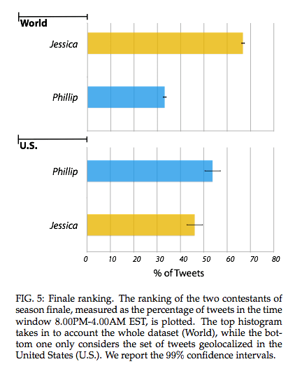 (Some excerpts by blog admin: “Jessica Sanchez related Tweets are 45% of the total if only U.S. is considered, while it rises to 64% if the whole World is considered.xxx Filipino-restricted Twitter activity concerning Jessica is strongly peaked in the two voting sessions of American Idol for the East and West timezones, and that numerous websites explicitly address the issue of ”voting tunnels”: “How to Vote for Jessica Sanchez from the Philippines and Other Non-US Countries”.xxx Our fundamental, and somehow naive, assumption is that the number of votes each contestant receives is proportional to the number of tweets that mention her. xxxIt is important to note that this is a very simple measure, and that we deliberately choose not to take into account many of the factors that in principle might affect the results, such as the presence of negative or neutral tweets, or attempts to directly affect the counts by spamming the system with automatically generated tweets. xxx If we consider the whole of our dataset, as we have done in the previous analysis, Jessica turns out to have been the most popular in Twitter in our time window.xxx Jessica is the only contestant that has a strong Twitter signal originating from outside of the U.S. (and in particular from the Philippines), with an increasing trend after the show on April 19.xxx However, the data show that the advantage of Phillip in the U.S. is remarkably smaller than the one of Jessica in the aggregated dataset xxx”)