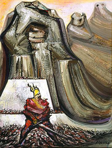 David Alfaro Siqueiro. Macbeth or The Criminal Panic. 1964. Duco on wood panel. For sale Mary Ann Martin/ Fine Art Gallery. Rightclicked from www.artnet.gallery searched thru www.artcyclopedia.com
