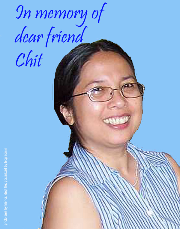 There will be a mass on May 11, 2012 at 10am at the U.P. College of Mass Communication auditorium in memory of Prof. Chit Estella-Simbulan organized by the Department of Journalism UPCMC. Family and friends are all invited – please join us!