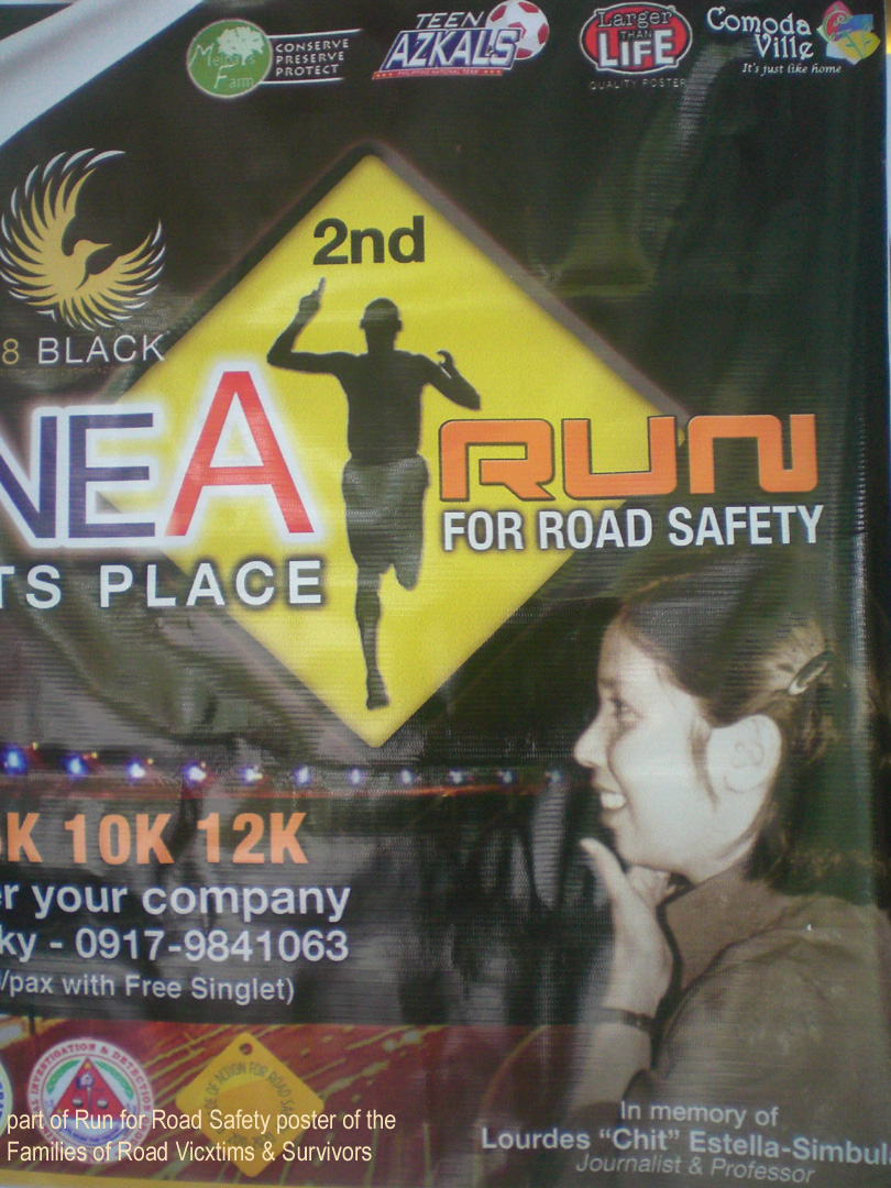 From Prof. Roland Simbulan : “On her first death anniversary on May 13 (a Sunday), there will be a Metro-Manila wide Run for Road Safety in memory of Chit coming from four points of Metro Manila: Antipolo, Quirino Grandstand, Gateway Cubao and Fairview. These runs will all converge at the Quezon City Memorial Circle, where a coordinated program will be held. This is sponsored and coordinated with many civic organizations, the DOTC, MMDA, LTO, LTFRB, Automobile Association of the Philippines, Motorcycles clubs, bicycle clubs/cyclist clubs, commuters association, and our newly organized FAMILIES OF ROAD VICTIMS AND SURVIVORS (FRVS), in which I have been made the lead convenor and chairman, with former Bulacan Obet Pagdanganan and Figaro Executive Pepe Alcantara as my co-convenors.