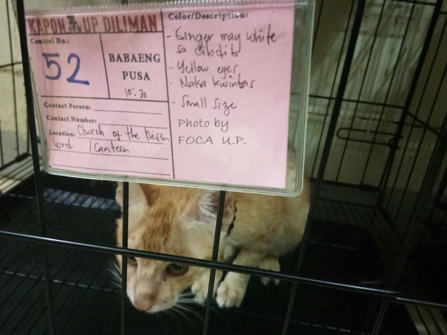 The University of the Philippines Diliman leads the way in the humane treatment of community animals. One hundred ninety -five U.P. Diliman campus cats and dogs were spayed and neutered last November 10, 2019 thru a project called “trap-neuter-vaccinate-return” (TNVR) by the UP administration in cooperation with the Animal Kingdom Foundation, Humane Society International, Philippine Veterinary Medical Association, FOCA U.P., members of the U.P. Diliman Social Service Brigade (Barangay U.P. campus village staff), and the Beta Sigma fratetnity. The treated dogs will then be garbed with maroon collars to identify them. (for some reason, in the past, the collars had to be re-supplied e.g., last year, Tisáy’s collars had to be replaced four or five times; Tisáy is a beautiful aspin who looks like a small golden retriever). The spayed/ neutered cats will have the tips of their ears surgically “tagged”.