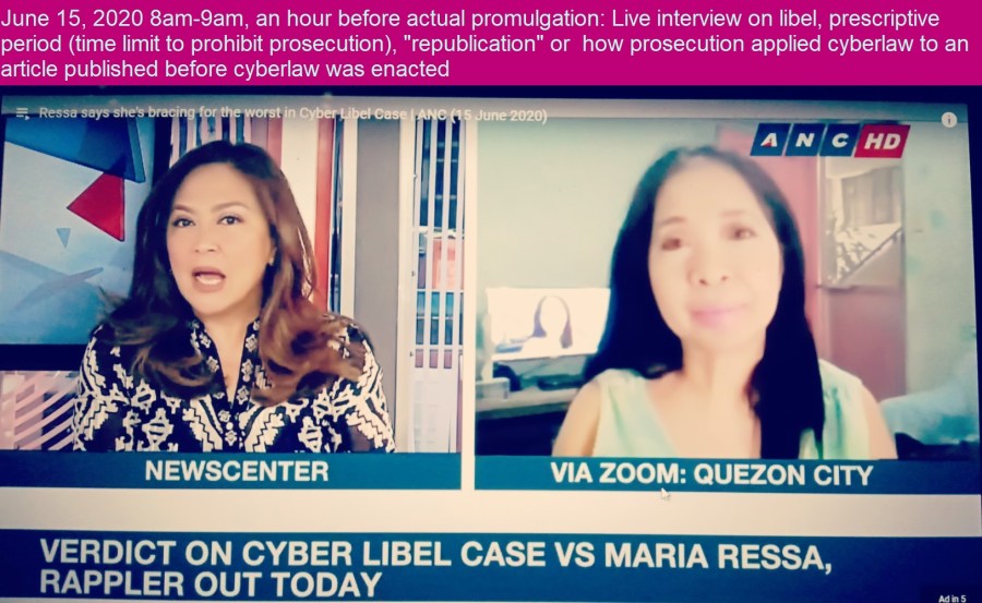 Twitter Video, Live Interview: An hour before promulgation cyberlibel case against journalists: ABS-CBN Headstart anchor Karen Davila asks specific questions on prescriptive period (time limit to prohibit prosecution) of libel and “republication” “theory” of prosecution to apply cyberlaw to article published before cyberlaw enacted
