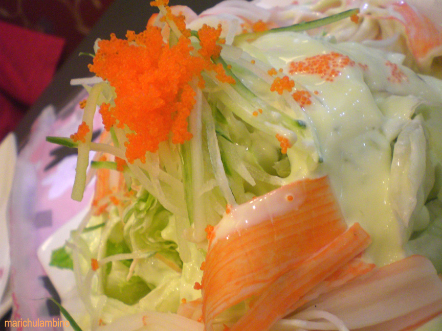 When we were kids, we nibbled  a lot of fish eggs — salted with kalamansi squeezed in (calamansi or small citrus fruit), or just plain fried; we called them boogie or buggi…When you’ve gone around, you’ll find out that there are alternatives (like —  sliced-thin crisp-fried tofu; not flabby and soggy but crisp until they could crumble; then, drain and dry off  the cooking oil with paper towel). Fish eggs as garnish, as caviar, as  sushi, or fried/ salted,  etc.  are of course never politically correct (remember Le Cirque‘s caviar of  Gloria Macapagal-Arroyo and her entourage?); never politically correct, not on any planet — serving them up is not a sustainable kind of consumption. [okay, this (in the photo) was supposed to be just a salad, they didn’t say it’d have fish eggs as garnish; i didn’t know! we never had it again; not my fault — soweee]