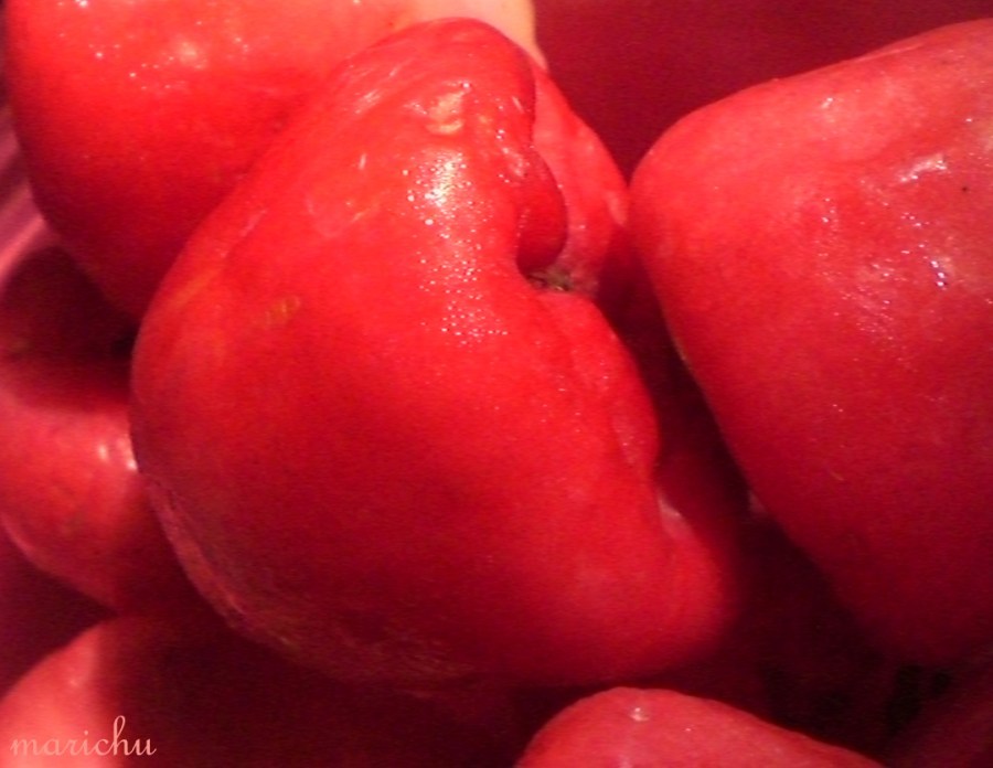 Have you ever tasted a makopa? it is infinitely more subtle in taste than an apple. The red skin cannot be separated from the white, succulent flesh inside, the small fruit being more delicately crunchier. And when you sink your teeth into it, there’s a primary note (scent) of small, fresh leaves, then a woodsy scent, and finally just a hint of slightly sweet flower sap in the end, the sap-taste clinging to your teeth and tongue for a few seconds.