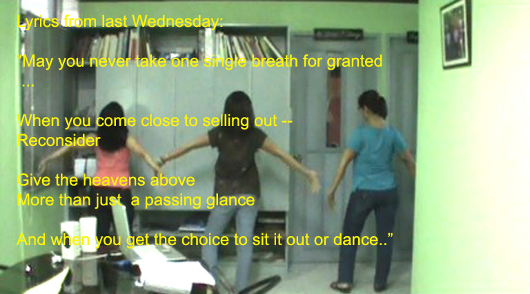 BUT … here’s another unknown video (see the “dancers” in the freeze-frame or photo above, with the graphics) of the first dance rehearsal with the choreographer and two unidentified “dancers” from two Christmases ago. The choreographer had a hectic schedule because it was Christmas, and was available for only two or three rehearsals, so Chit, Ricci, and Khrysta had the brilliant idea of asking the staff to put a camera on a tripod, and filming the choreographer with the two unknown “dancers”, so they could follow later.