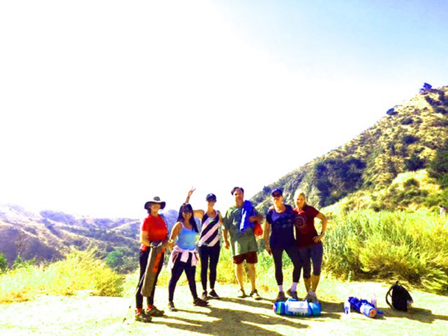 We climbed up to a plateau and exhilarated in the view … then walked to a grassy knoll under the trees, with cool breeze, chirping birds and the scent of citrus fruits … and yoga teacher Amabile Dyer inspired us to curl and stretch to our yoga poses … and to express gladness and thanks for the love and affection of family and friends, and for our time here on the mountains at O’Melveny Park in the hills, mountains,