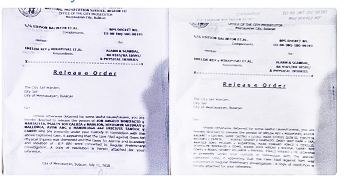 Copy of release order provided by Atty. Paul Heherson Balite to the news media, screenshot by blog admin from the twitter account of Nato Reyes, used here non-commercially for academic purposes